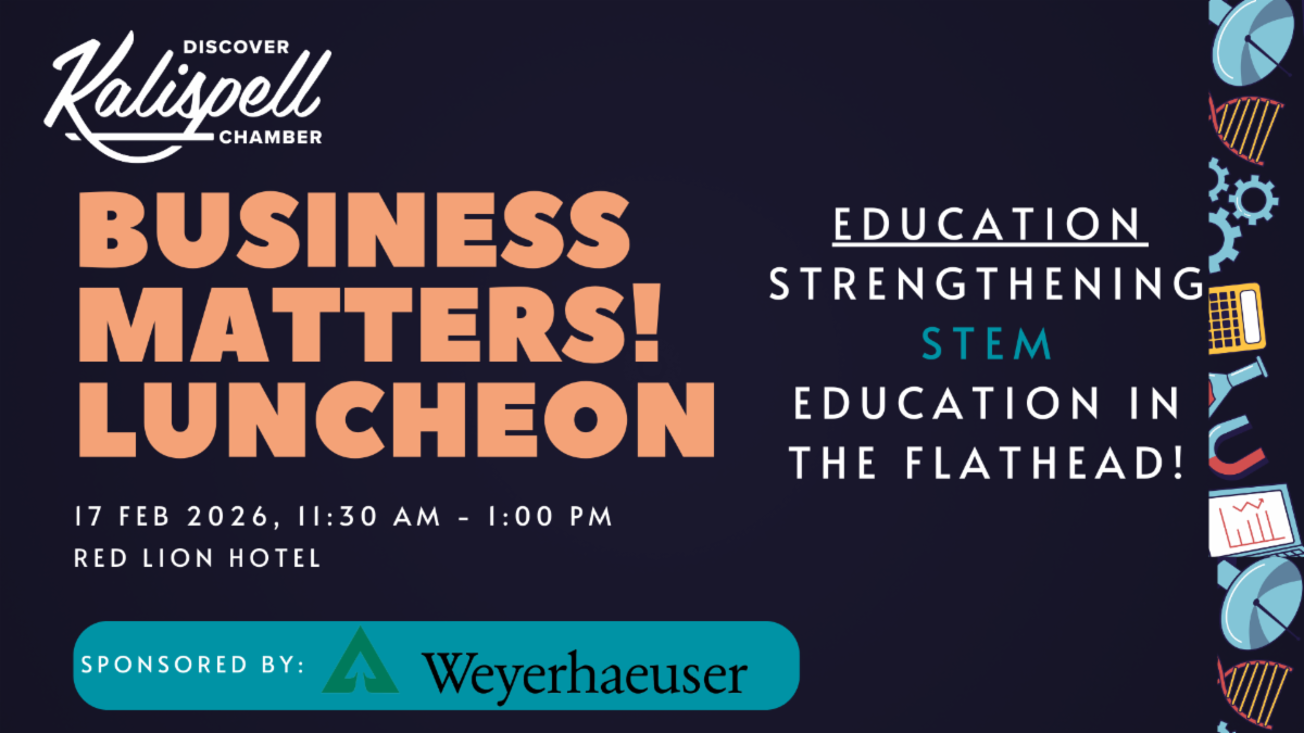 | Join us Tuesday, February 17th at the Red Lion Hotel for our February Business Matters Luncheon focused on strengthening STEM education in the Flathead Valley. You’ll hear updates from Kalispell Public Schools and the Kalispell Education Foundation on local classroom initiatives and career-pathway efforts, along with insights from Dr. Tim VanReken, Executive Director of the Headwaters Tech Hub, on innovation, workforce alignment, and how STEM education supports a wide range of career fields. If you’re interested in education, workforce development, or the long-term vitality of our community, this is a great opportunity to stay informed and connected. Reserve your seat and join the conversation. Tuesday, February 17 Red Lion Hotel 11:30 AM – 1:00 PM Register Now to secure your spot! |