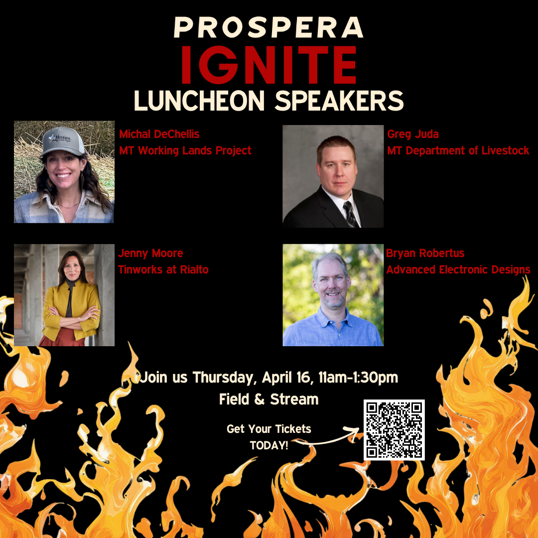 Prospera Business Ignite Luncheon Join us for Prospera’s signature event and hear from these incredible speakers. Learn about their innovative and creative business practices and the exciting work they are doing here in Gallatin and Park Counties. Michal DeChellis, Montana Working Lands Project Michal DeChellis is a food systems strategist working to strengthen Montana’s agricultural economy from soil to market. As Co-Director of the Montana Working Lands Project, she advances holistic land management, producer education, and market development that supports thriving rural communities. Through her consulting practice, Cultivating Minds, Michal partners with Montana based organizations to design community food system assessments and build coordinated supply chain solutions, helping Montana-grown food move into Montana schools and institutions at scale. A former organizational psychologist and current instructor at Montana State University, Michal brings a systems lens to cross-sector collaboration—building the relationships and infrastructure needed for lasting economic and ecological resilience. Greg Juda, Montana Department of Livestock Gregory Juda, Ph.D. is currently the Director of the Montana Veterinary Diagnostic Laboratory (MVDL), a Bureau of the Montana Department of Livestock and the only accredited veterinary diagnostic laboratory in the State of Montana. The MVDL performs approximately 170,000 annual individual diagnostic testing services on behalf of Montana veterinarians and livestock producers to help protect animal and public health within the state. In his role as Director, Dr. Juda is responsible for managing all aspects of the laboratory testing operations with a staff of over 20 personnel. Jenny Moore, Tinworks at Rialto Jenny Moore is the inaugural Director of Tinworks Art in Bozeman, Montana. From her start in 2023, she has established the non-profit as an artist-centered, community-oriented organization. Significant artistic projects under her direction include a major new ecological artwork by Agnes Denes, Wheatfield—An Inspiration. The seed is in the ground, the first time Denes has accepted the invitation to reconsider her iconic Wheatfield—A Confrontation, from 1982, in another American context; the group exhibitions The Lay of the Land and A Kin to Clay; and the incorporation of the historic Rialto theater into Tinworks’ programs and project venues, with the Montana premier of Matthew Barney’s Redoubt. An arts professional for more than 25 years, Jenny has held curatorial positions at the New Museum (NYC), the Andy Warhol Foundation for the Visual Arts (NYC), Exit Art (NYC) and the 8th Gwangju Biennale (South Korea). Throughout her career, she has been drawn to experimental, artist-centered spaces in unconventional places. Bryan Robertus, Advanced Electronic Designs As AED’s Chief “Engineering” Officer, Bryan looks beyond the engineering of a product to make sure AED serves the best interests of the client and end user. His ability to see the big picture allows him to make solid engineering decisions and elegant designs. He’s streamlined AED into a flexible, tight company without corporate baggage and red tape. Working side by side with his creative staff eliminates the layers of management, giving his clients desirable timelines and excellent results. Bryan had to choose between music and engineering early in his career. You may hear Bryan playing the sax in big bands around Bozeman, find him enjoying his family, or in his home workshop. His house is probably the only house in the valley with a dedicated Lego room. Business Ignite Luncheon Thursday April 16, 2026 11am-1:30pm Field & Stream Lodge |