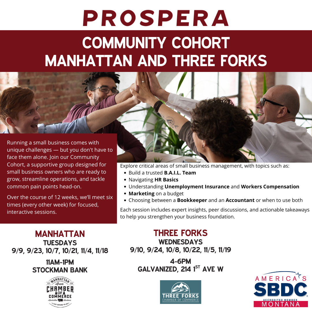 Community Cohorts in Manhattan and Three Forks Running a small business comes with unique challenges — but you don’t have to face them alone. Join our Community Cohort, a supportive group designed for small business owners who are ready to grow, streamline operations, and tackle common pain points head-on. Over the course of 12 weeks, we’ll meet six times (every other week) for focused, interactive sessions. Each meeting will explore a critical area of small business management, with topics such as: - Building a trusted B.A.I.L. team (Banker, Accountant, Insurance, Lawyer)